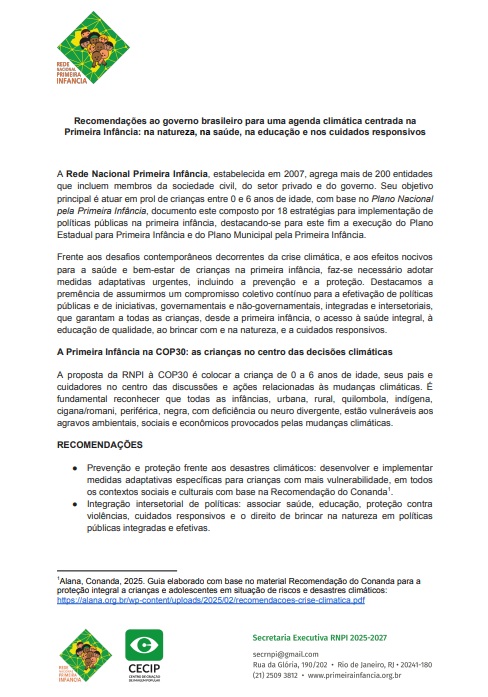 Recomendações ao governo brasileiro para uma agenda climática centrada na Primeira Infância: na natureza, na saúde, na educação e nos cuidados responsivos