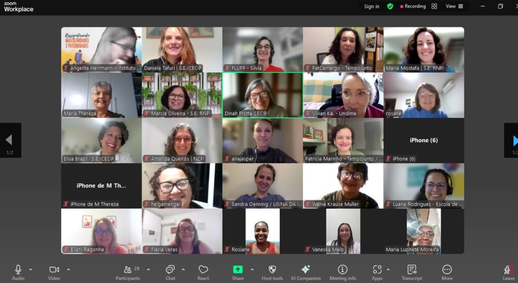 Na parte da tarde, o momento foi de trocas e conexões. As Redes Estaduais pela Primeira Infância do Maranhão, Rio Grande do Sul e Bahia apresentaram boas práticas, desafios e perspectivas, abrindo-se um diálogo sobre possibilidades de apoio mútuo e articulações entre elas e com a Rede Nacional. Em seguida, foi a vez das comissões temáticas. As CTs Crianças com Saúde, Educação Infantil, PMPI e PEPI e Proteção às Infâncias e Prevenção de Violências relataram suas atividades neste semestre e planos de organização e atuação futuras. Por último, foi formalmente apresentada a CT Paternidades, implementada recentemente para retomar as discussões e ações acerca dos cuidados compartilhados e da equidade de gênero na parentalidade, com convite para que mais organizações integrem o grupo.