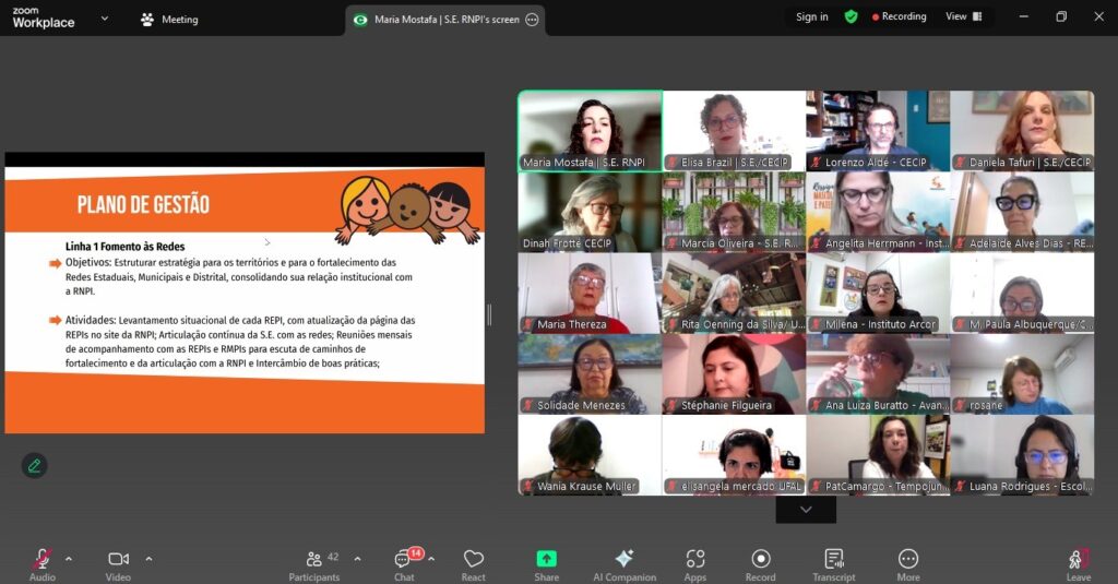 Dois dias para compartilhar experiências, pensar caminhos e reafirmar propósitos comuns. A primeira Assembleia Geral Ordinária de 2025 da Rede Nacional Primeira Infância foi também a primeira da atual gestão do CECIP, que completa seis meses à frente da Secretaria Executiva, e reuniu cerca de 40 organizações integrantes e 13 redes estaduais e municipais, nos dias 17 e 18 de junho. O encontro online teve foco na apresentação do novo plano de gestão e em deliberações coletivas, incluindo a aprovação de novos membros, e contou com momentos de diálogo entre as REPIs e as comissões temáticas. A agenda do segundo dia foi inteiramente dedicada aos temas da sustentabilidade e governança.
