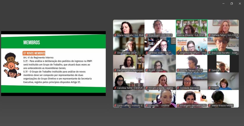 O primeiro bloco da programação, na manhã do dia 17, começou com a apresentação do novo plano de gestão da Secretaria Executiva, com sete linhas de ação: Fomento às Redes; Mobilização e Articulação; Incidência; Produção e Disseminação de Conhecimento; Comunicação; Formação; e Governança e Sustentabilidade. Na sequência, a assembleia votou e aprovou a entrada na Rede de nove organizações, com candidaturas já previamente analisadas e recomendadas pelo GT Novos Membros. Passam a fazer parte da RNPI a Casa de Brincar Criança Feliz (Eunápolis/BA), o CoCriança (São Paulo/SP), o ComCrianças (Porto Alegre/RS), o Erê Lab (São Paulo/SP), o Instituto Fefig de Educação, Cultura e Esportes (São Paulo/SP), o Instituto Mapear (Rio de Janeiro/RJ), a Fundação Visconde de Cabo Frio (São Paulo/SP), a Fundação Van Leer (São Paulo/SP) e a Fundação Universidade Federal de Ciências da Saúde de Porto Alegre (Porto Alegre/RS). O grupo aprovou ainda a retomada de um fluxo para notas oficiais de posicionamento da Rede, com a decisão de adotar o documento elaborado para este fim em 2019, que será aprimorado pelo Grupo Diretivo durante o segundo semestre.