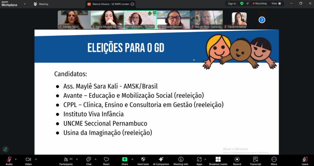À tarde, o último bloco da programação começou pela votação e aprovação da entrada na Rede de seis novas organizações, com candidaturas já previamente analisadas pelo GT Novos Membros. Passam a fazer parte da RNPI a Aldeias Consultoria (Colinas/RS), a Federação Brasileira das Associações de Síndrome de Down (Brasília/DF), a Secretaria de Estado do Desenvolvimento Humano/Coordenação Estadual da Primeira Infância da Paraíba (João Pessoa/PB), a ÍNTEGRA – Centro de Desenvolvimento Humano Relacional (Fortaleza – CE), o MOV – Movimento Internacional de Juventudes (Rio Lago, AL) e a SECRIA – Secretaria da Primeira Infância de Alagoas (Maceió/AL). Em seguida, foi retomada a conversa sobre a atuação da Rede Nacional Primeira Infância na implementação da PNIPI, com uma proposta de debate sobre as potencialidades das organizações integrantes em relação às prioridades elencadas na carta de alinhamento, em especial aos planos estaduais e municipais pela primeira infância. Os participantes foram dividos em quatro salas virtuais, nas quais puderam dialogar livremente, para, na sequência, compartilhar em plenária suas principais dúvidas, propostas e sugestões.